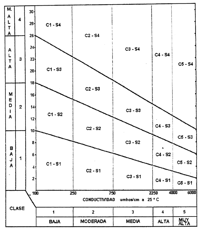 Así, calculado el valor del RAS de un agua y conocida su conductividad, se pueden establecer 16 categorías mediante la combinación de los intervalos de conductividad (C1- C4) que nos indican el peligro de salinización, y los intervalos de RAS (S1- S4) que indican el peligro de alcalinización.